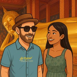 Der Tempel ist beeindruckend schon von außen: glänzende Stupas, verzierte Dächer und der Duft von Räucherstäbchen. Anong erklärt: „Wat Pho is very old, more than 200 years.“ Wir schlendern durch die Anlage, vorbei an kleinen Schreinen.