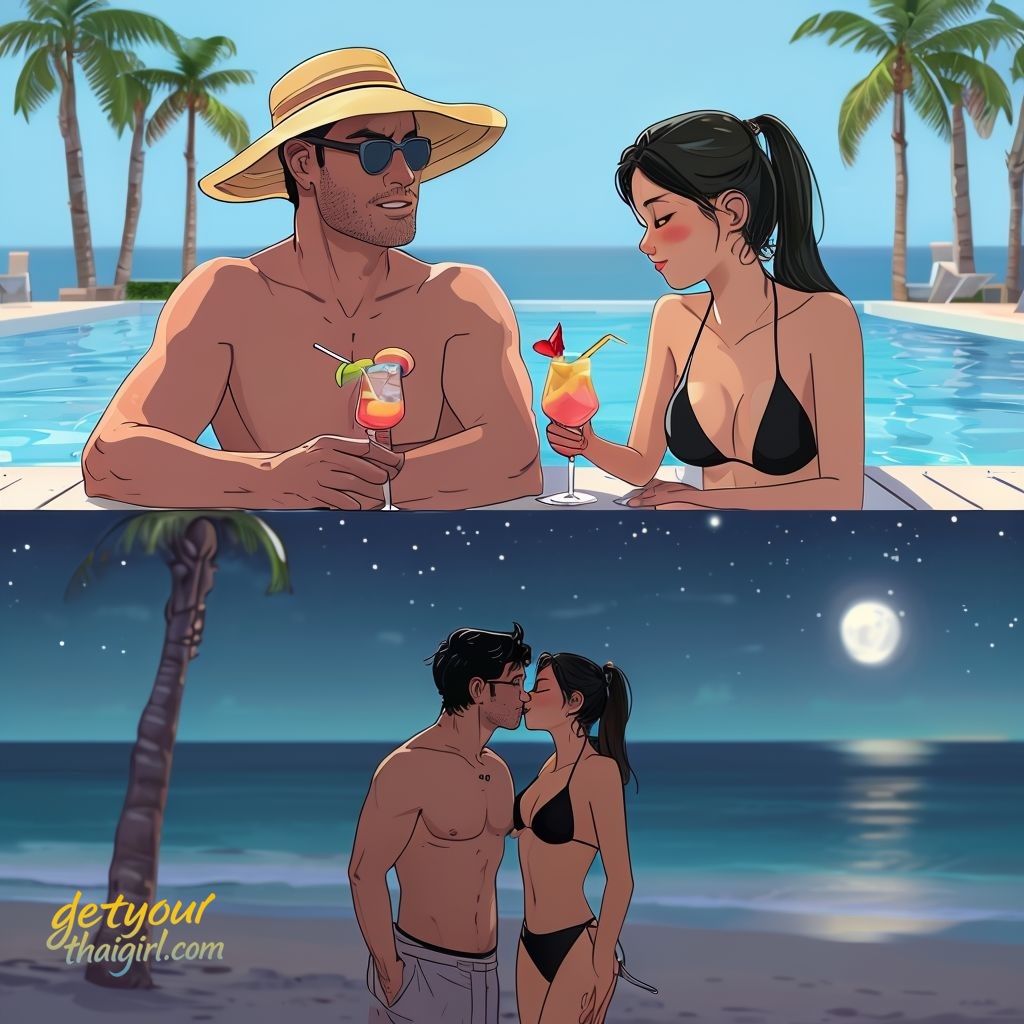 Nach dem Essen sind wir noch ein Stück am Strand entlang gelaufen. Barfuß, Flip-Flops in der Hand, Musik von irgendeiner Bar in der Ferne. Irgendwann blieben wir stehen, direkt am Wasser. Keine großen Worte. Nur ein Blick – dann hat sie mich geküsst. Ganz sanft. Ganz echt. Ganz plötzlich.